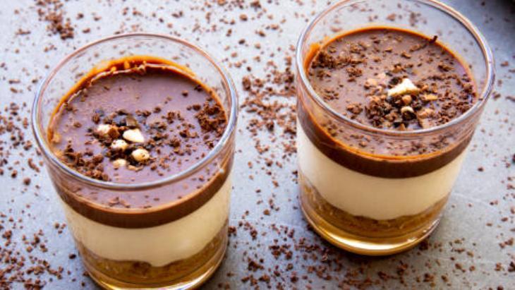 Diğer tarafta büyük kare borcamın tabanına ya da bardaklara boşluk kalmayacak şekilde kakaolu bisküvilerden yerleştirin. Bisküvilerin üzerine hazırladığınız muhallebiyi döküp, güzelce yayın. Muhallebinin üzerine de aynı şekilde kakaolu bisküvilerden yerleştirebilirsiniz. Sonraki aşamada çikolatayla buluşturacağız.