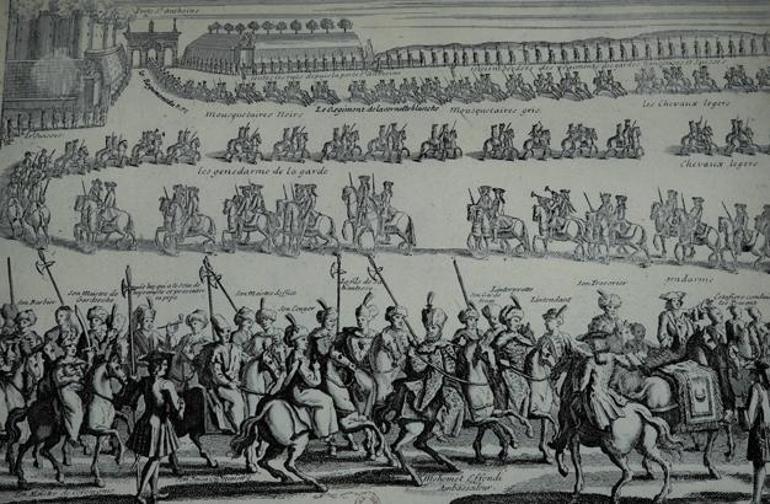 Bunun için yapay zekadan, Osmanlı elçisinin Paris'teki Tuileries Bahçesi'ne giriş sahnesini ölümsüzleştiren ve bugün Versailles'da sergilenen şaheserin sahibi Charles Parrocel'in üslubunu taklit etmesi talep edilmiştir. Bu akşam sergilenen eserler arasında bu tablonun bir nüshasını da göreceksiniz" diye konuştu.
