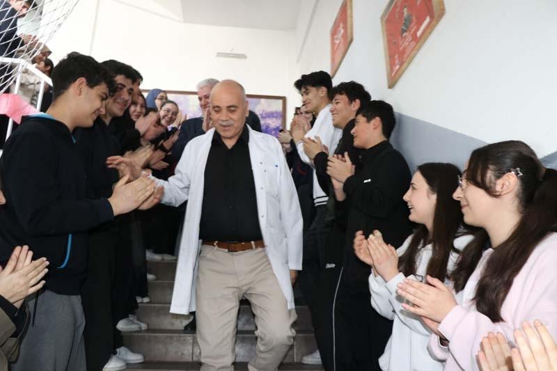 Öğretmenler odasından bina kapısına kadar öğrencilerinin arasından alkışlarla yürüyen Kök'e, hem öğrencisi hem de meslektaşı olan öğretmenler tarafından çiçek verildi.