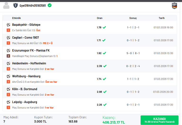 7 maçla 163.68 oran yakaladı, 406.213TL kazandı…