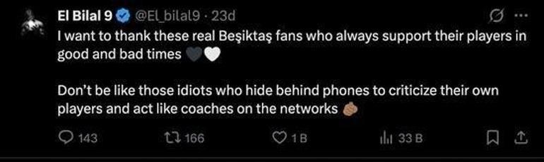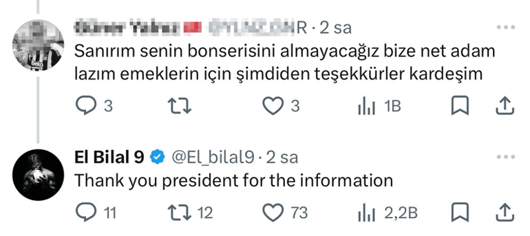 Beşiktaşlı bir taraftarın “Sanırım senin bonservisini almayacağız, bize net adam lazım. Emeklerin için şimdiden teşekkürler, kardeşim.” sözlerine El Bilal Toure: “Bilgi için teşekkürler, başkan.” yanıtını verdi.