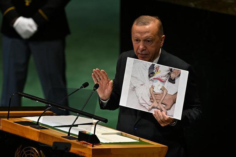 Cumhurbaşkanı Erdoğan, konuşmasında, İsrail'in 2 yıldır soykırım ve etnik temizlik suçları işlediği Gazze Şeridi'ndeki insani felaketi belgeleyen fotoğrafları gösterdi. Erdoğan'ın paylaştığı fotoğraflarda, AA için çalışan Ali Jadallah ve Abdullah el-Attar'ın zorlu şartlar altında çektiği kareler de yer aldı.
