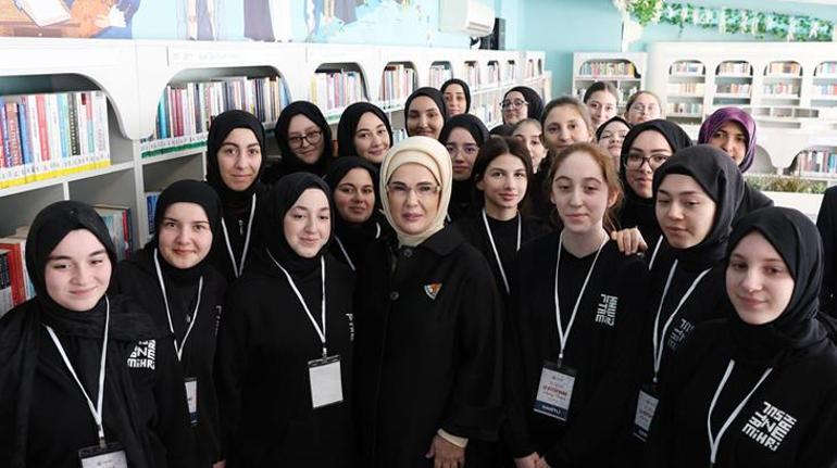 Öğrencilere kütüphaneleri boş bırakmamaları konusunda ricada bulunan Emine Erdoğan, “Bugün aramızda okulumuzun pırıl pırıl öğrencileri var. Eminim ki onlar da böyle güzel imkanlarla donatılmış bir kütüphaneye kavuştukları için çok heyecanlılar. Sevgili öğrenciler, sizlerden kütüphanenizi hiç boş bırakmamanızı rica ediyorum. En başta kendi iyiliğiniz için lütfen bol bol okuyun. Çünkü kitap kapakları bambaşka diyarlara açılır. Bazen bir kitapla Evliya Çelebi'nin seyahatlerine eşlik edersiniz, bazen Tanpınar'la 'Beş Şehir'de yolculuk yaparsınız, bazen Nurettin Topçu'nun cemiyet için düşünce koridorlarında, bazen Mevlana'nın gönül bahçelerinde gezersiniz. Bazen de Akif'in, Sezai Karakoç'un, Necip Fazıl'ın mısralarında büyük fikirlerle, derin hislerle tanışırsınız. Ben zaten sizlerin yüzlerine baktığımda her birinizin birer kitap kurdu olduğunu görüyorum. O yüzden gelin hepiniz birer gönüllü kütüphane elçisi olun. Kitaplarla henüz sizin kadar haşır neşir olmamış arkadaşlarınız varsa kitap kulüpleri kurarak, okuma maratonları başlatarak onları da okul kütüphanenize davet edebilirsiniz. Ve hiçbiriniz 'Boş zamanlarımda kitap okuyorum' demeyin. 'Kitap okumaktan hiç boş zamanım kalmıyor' deyin inşallah" diye konuştu.