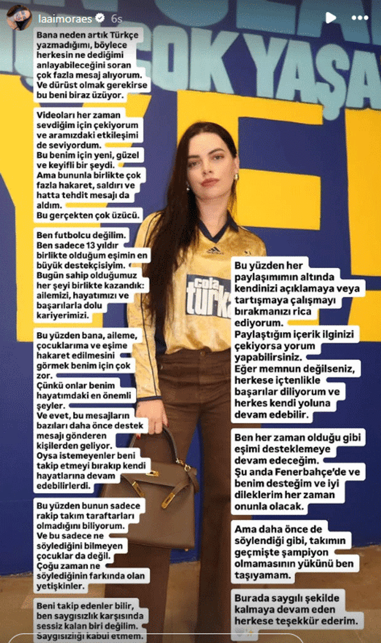 Videoları her zaman sevdiğim için çekiyorum ve aramızdaki etkileşimi de seviyordum. Bu benim için yeni, güzel ve keyifli bir şeydi. Ama bununla birlikte çok fazla hakaret, saldırı ve hatta tehdit mesajı da aldım. Bu gerçekten çok üzücü. Ben futbolcu değilim. Ben sadece 13 yıldır birlikte olduğum eşimin en büyük destekçislylm. Bugün sahip olduğumuz her şeyi birlikte kazandık: Ailemizi, hayatımızı ve başarılarla dolu kariyerimizi.