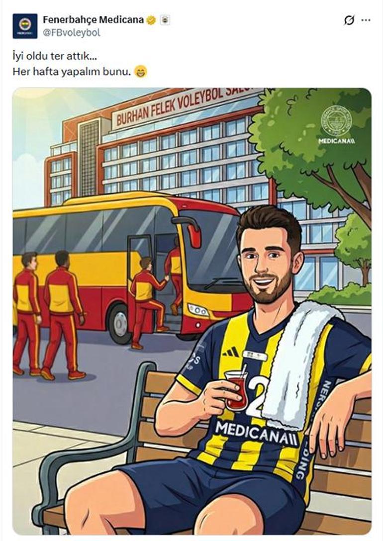 Sarı-lacivertli kulüp galibiyet sonrasında sosyal medya hesabından göndermeli bir paylaşımda bulundu. Otobüse binen sarı-kırmızılı voleybolculara Fenerbahçeli Adis Lagumdzija'ın "İyi oldu ter attık... Her hafta yapalım bunu." sözleriyle seslenmesi resim olarak canlandırıldı.