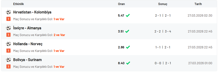 Misli üyesi, Dünya Kupası Elemeleri Play- off ve hazırlık maçlarından seçtiği karşılaşmalara ‘’Maç Sonucu ve Karşılıklı Gol’’ tercihini yaptı. Misli üyesinin kuponunda yer alan ve kuponundaki ilk karşılaşma olan Bolivya Surinam mücadelesinde ilk yarı golsüz geçildi. Dünya Kupası’na giden yolda Play- off yarı final maçı olduğu için oldukça sert geçen karşılaşmada ilk gol ikinci yarının başında Surinam’dan geldi. 48.dakikada geri düşen Bolivya çok iyi bir reaksiyon göstererek 72. ve 79. dakikada attığı gollerle mücadeleyi kazanarak Dünya Kupası Elemeleri’nde Play -off finaline yükselmeyi başardı. Bu sonuçla birlikte Misli Üyesi, 8.40 ile kuponunda yer verdiği maçlardan en yüksek oranı tutturmuş oldu. Misli üyesi, kuponunda yer verdiği diğer maçları hazırlık karşılaşmalarından seçti. Hırvatistan- Kolombiya ve Hollanda- Norveç maçlarına ‘’Maç Sonucu 1 ve Karşılıklı Gol Var’’ tercihlerini yaptı. Hırvatistan, Kolombiya karşısında maçın henüz başında geriye düşse de hemen karşılık verdi ve hızlı başlayan maç 6.dakikada 1-1’e geldi. Daha sonra 42. Dakikada gelen Matanovic’in golüyle 2-1 öne geçen Hırvatistan mücadeleyi de bu skorla kazanmasını bildi. Misli üyesi, bu sonuçla 5.47 oranı tutturmuş oldu. Son ‘’Maç Sonucu 1 ve Karşılıklı Gol Var’’ tercihinde ise yine bir geri dönüş yaşandı. 24. Dakikada Schjelderup’un golüyle öne geçen Norveç, 35.dakikada gelen Van Dijk’ın golüne engel olamadı ve mücadelenin ilk yarısı 1-1 bitti. 2. yarıda gelen Reijnders’in golüyle 2-1 öne geçen Hollanda, bu sonucu koruyarak mücadeleyi 2-1 kazanmış oldu. Misli üyesi, bu sonuçla 2.86 oranı tutturmuş oldu.