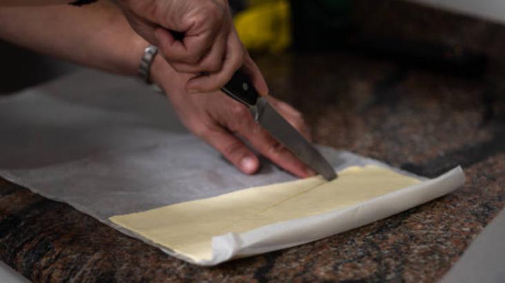 Tarife başlamadan önce kullanacağınız tezgâhı iyice unlamalısınız. Daha sonra unladığınız tezgâha milföy hamurunu alabilirsiniz. Milföylerin üzerine erittiğimiz tereyağından sürebilirsiniz.
