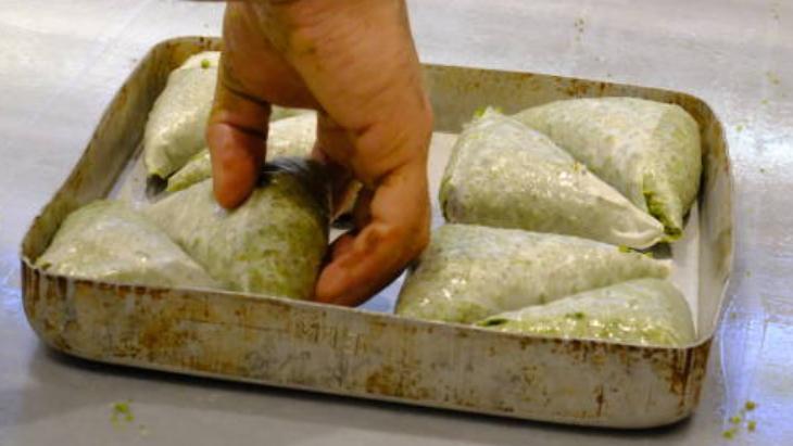 Önce 1 kat yufkayı tezgâha alıp üzerine yağ gezdirip her yerine eşit olacak şekilde yayarak başlayın. Ardından üzerine 1 kat daha yufka koyun ve yine yağlayın. Bu aşamada baklavanın eşsiz malzemesi fıstık içini yufkaların üzerine serpin. Yufkanın kısa kenarını 3 bölüm gibi düşünüp en tepe kısmına 1 er kaşık fındık kreması koyun.