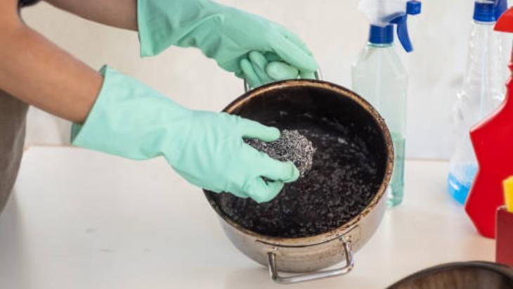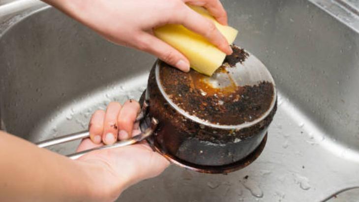 Yanmış yağ ve yemek artıkları, tencere temizliğini zorlaştırır. Yanmış bir tencereyi temizlemeden önce, yüzeydeki kalıntılar bir spatula yardımıyla nazikçe kazınabilir. Tencerenin içine su doldurularak kaynatılması gerekir. Kaynayan suyun içine bir miktar sirke veya limon suyu ekleyip yanık lekelerinin yumuşamasını sağlayabilirsiniz. Kaynayınca tencere soğutulup ve yumuşamış lekeler süngerle temizlenir.