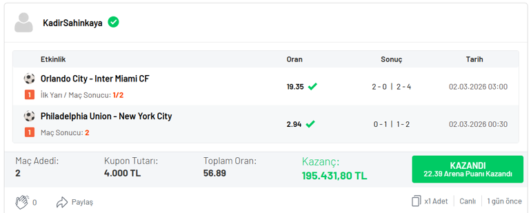 Misli üyesi bu sonuçlarla toplamda 56.89 oran yakaladı ve 4000 TL yatırdığı kuponuyla 195.431.80 TL kazandı. Misli üyesi bu kuponlarıyla Misli Arena’da günün “En İyi 20” kuponu arasında yer aldı.