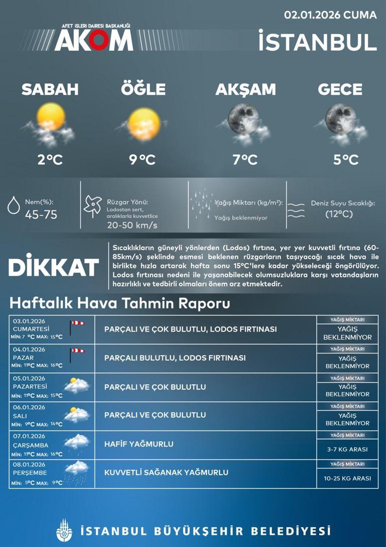 Lodos kapıda. Sıcaklık artıyor ama risk büyüyor. Hafta sonu İstanbul'da güneyli yönlerden esecek olan Lodos, sıcaklıkları bir anda 15-16°C seviyelerine kadar çıkaracak. Ancak bu ısınma göründüğü kadar masum değil; hızı 85 km/s'ye kadar ulaşması beklenen kuvvetli fırtına nedeniyle AKOM, İstanbulluları yaşanabilecek olumsuzluklara karşı şimdiden uyardı.