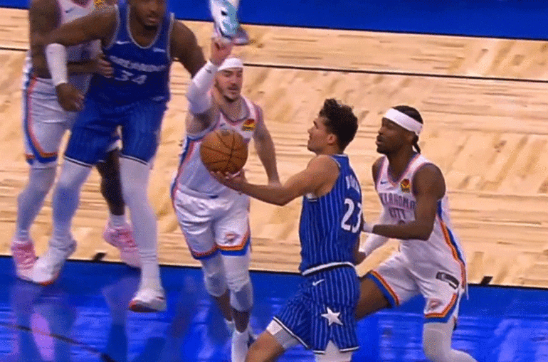 Oklahoma City Thunder deplasmanda Orlando Magic'i 113-108 mağlup ederken Alex Caruso'nun ayakkabısı ile blok yapması gündem oldu.