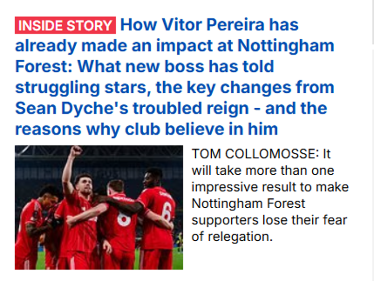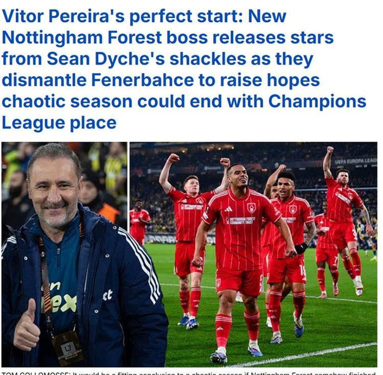 DAILY MAIL: Vitor Pereira'nın mükemmel başlangıcı: Yeni Nottingham Forest teknik direktörü, Fenerbahçe'yi darmadağın etti. Sezon boyu saha içi ve saha dışında sık sık dağınık bir görüntü sergileyen Forest, İstanbul'da unutulmaz bir performans sergiledi, pahalı bir kadroyla sahaya çıkan Fenerbahçe'yi bozguna uğrattı.