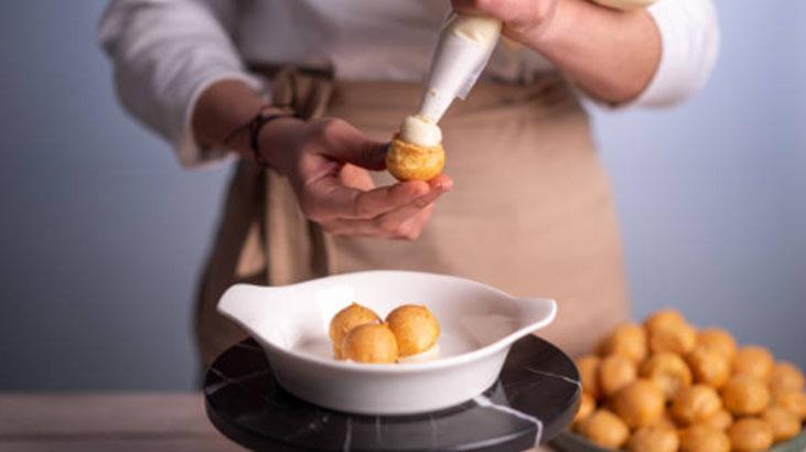 Tepsiyi fırına verin ve üzerleri iyice kızarana kadar yaklaşık 35–40 dakika pişirin. Bu süre boyunca fırın kapağını açmayın. Pişen hamurları fırından çıkarıp oda sıcaklığında soğumaya bırakabilirsiniz. Hamurlar pişerken kremayı hazırlayın. Vanilya hariç tüm krema malzemelerini tencereye alın. Orta ateşte sürekli karıştırarak koyu bir muhallebi kıvamı elde edene kadar pişirin. Kıvam alınca ocaktan alın, vanilyayı ekleyip karıştırın. Krema ılıdığında kullanıma hazır olacak.
