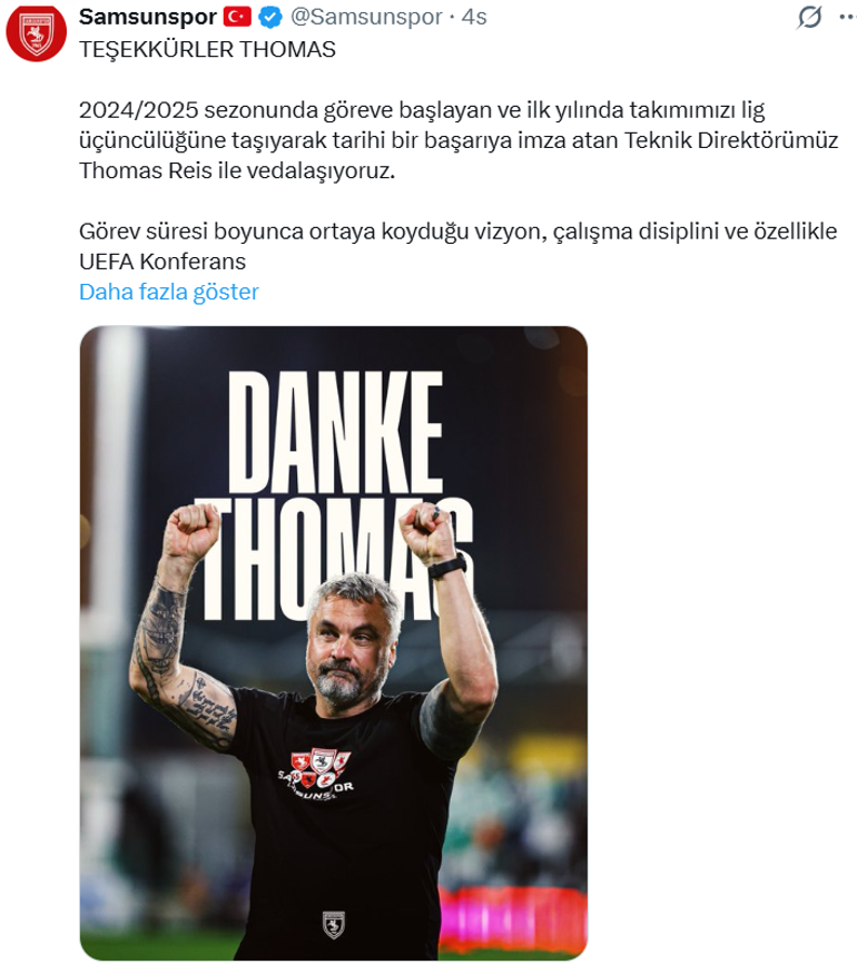 "2024/2025 sezonunda göreve başlayan ve ilk yılında takımımızı lig üçüncülüğüne taşıyarak tarihi bir başarıya imza atan Teknik Direktörümüz Thomas Reis ile vedalaşıyoruz.