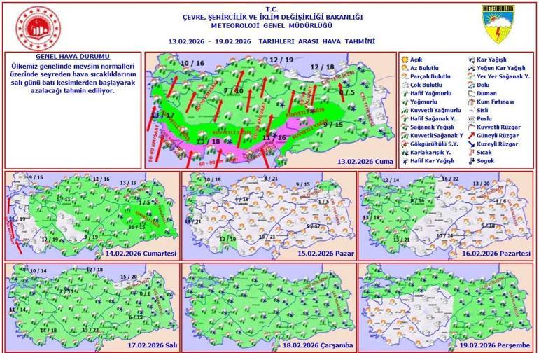 Meteoroloji Genel Müdürlüğü İzmir Bölge Tahmin ve Erken Uyarı Merkezi tarafından, İzmir için kuvvetli gök gürültülü sağanak beklendiği uyarısının ardından gece saatlerinde kentte sağanak yağış etkili oldu. Kentin merkez ilçelerindeki bazı cadde ve sokaklarda su birikintileri oluşurken, trafikte bulunan araç ve motosiklet sürücüleri zor anlar yaşadı. (Mustafa İÇ/ İZMİR, (DHA) Osmaniye'de sağanak ve kuvvetli fırtına hayatı olumsuz etkiledi. Fakıuşağı Mahallesi'nde kuvvetli rüzgar nedeniyle yan yatan ağaçlar, itfaiye ekiplerinin çalışmasıyla kesilerek kaldırıldı. Devlet Bahçeli Bulvarı ile Musa Şahin Bulvarı kavşağının yan sokağında su birikintisi içinde kalan motosikletli, itfaiye ekiplerince kurtarıldı. Su içinde kalan araçlar da ekiplerin çalışmasıyla güvenli alanlara çekildi. İtfaiye erleri, araçlarında mahsur kalan vatandaşları sırtında taşıyarak güvenli bölgeye götürdü. Osmaniye Valisi Mehmet Fatih Serdengeçti, sanal medya hesabından yaptığı açıklamada, “Osmaniye’mizde etkisini artıran yoğun yağışlar nedeniyle bazı bölgelerde su baskınları ve trafik aksamaları yaşanmaktadır. Zorunlu olmadıkça trafiğe çıkmamanızı ve riskli güzergâhlardan uzak durmanızı önemle rica ediyorum. Ekiplerimiz sahada; gelişmeleri anbean takip ediyor ve olumsuz hadiselere ivedilikle müdahale ediyoruz” dedi. Öte yandan Valilik'ten yapılan meteorolojik uyarıda, 13 Şubat 2026 Cuma günü sabah saatlerinden itibaren Osmaniye genelinde kuvvetli sağanak ve gök gürültülü sağanak yağış beklendiği belirtilerek, sel, su baskını, yıldırım, heyelan, ulaşımda aksamalar, yerel dolu yağışı, kuvvetli rüzgar ve fırtına gibi olumsuzluklara karşı vatandaşların dikkatli ve tedbirli olması istendi. Belediye ile AFAD ve DSİ’ye ait ekiplerin sahada teyakkuz halinde oldukları bildirildi. (İbrahim EMÜL/ OSMANİYE, (DHA) Meteoroloji Genel Müdürlüğü'nün 'sarı' kodlu uyarıda bulunduğu Adana'da sağanak akşam saatlerinde etkisini gösterdi. Yaklaşık bir saat süren sağanak, hayatı olumsuz etkiledi. Kent geneli caddeler, sağanak nedeniyle göle döndü. Trafiği güçlükle ilerlediği su basan yollarda, bazı araçlar arızalandı. Suda kalıp, arızalanan araçlar, sahipleri tarafından itilerek güvenli yerlere götürüldü. DSİ'ye ait boş sulama kanalları da sağanakla birlikte suyla doldu. İl genelinde sağanağın gece saatlerinde de etkili olması bekleniyor. Öte yandan Adana Büyükşehir Belediyesi ekipleri de yapılan çok sayıda ihbar üzerine su basan noktalarda çalışma başlattı. (Gökhan KESKİNCİ/ ADANA, (DHA) Kaş, Kumluca, Alanya, Finike, Gazipaşa, Demre ve Kemer kaymakamlıklarının yaptığı açıklamada, Meteoroloji Genel Müdürlüğünden alınan son verilere göre ilçelerde devam eden ve yarın etkisini artırması beklenen şiddetli sağanak, gök gürültülü sağanak ve fırtına şeklindeki olumsuz hava koşullarının risk oluşturduğu belirtildi. Muhtemel sel, su baskını, yıldırım, heyelan ve ulaşımda yaşanabilecek aksamaların göz önünde bulundurulduğu kaydedilen açıklamada, öğrencilerin ve vatandaşların can güvenliğini sağlamak amacıyla Milli Eğitim Bakanlığına bağlı resmi ve özel tüm örgün ve yaygın eğitim kurumları, Kur’an kursları, rehabilitasyon merkezleri, kreşler, gündüz bakımevleri ve çocuk kulüplerinde bugün eğitime 1 gün süreyle ara verildiği bildirildi. Açıklamada, kamu kurumlarında görev yapan hamile, engelli ve ağır kronik hastalığı bulunan personel ile çocuğu anaokulu ve kreşe devam eden kadın personelin aynı tarihte idari izinli sayılacağı aktarıldı. Meteoroloji Genel Müdürlüğü olarak yapılan değerlendirmelere göre: Ülkemiz genelinin çok bulutlu, Marmara, Ege, Akdeniz, İç Anadolu, Akdeniz, Batı Karadeniz, Orta ve Doğu Karadeniz'in iç kesimleri, Doğu Anadolu'nun güney ve batısı, Güneydoğu Anadolu ile Erzurum ve Ağrı çevrelerinin yağışlı geçeceği tahmin ediliyor. Yağışların; genellikle yağmur ve sağanak, Kıyı Ege ve Akdeniz kıyılarında yer yer gök gürültülü sağanak, Akdeniz ve Karadeniz’in iç ve yüksek kesimleri ile Doğu Anadolu’nun kuzey ve doğusunda karla karışık yağmur ve kar şeklinde olması bekleniyor. Yağışların; Güney ve Kıyı Ege, Akdeniz, İç Anadolu’nun güneyi, Doğu Anadolu’nun güney ve batısı ile Erzurum, Çanakkale, Adıyaman çevreleri, Balıkesir, Gaziantep, Kilis ve Diyarbakır'ın batısında kuvvetli, İzmir’in güneyi, Aydın, Muğla, Antalya, Burdur ve Isparta illerinin güneyi, Mersin, Adana, Osmaniye, Kahramanmaraş ve Malatya çevreleri, Kayseri'nin güneyinde çok kuvvetli ve yerel şiddetli olması bekleniyor. Sabah ve gece saatlerinde doğu bölgelerde buzlanma ve don olayı bekleniyor. Doğu Karadeniz’in iç kesimlerinin yüksekleri ile Doğu Anadolu’nun doğusunda yüksek kar örtüsüne sahip eğimli kesimlerinde çığ ve kar erimesi tehlikesi bulunmaktadır. HAVA SICAKLIĞI: Hava sıcaklığının yurt genelinde mevsim normallerinin üzerinde seyredeceği tahmin ediliyor. RÜZGAR: Genellikle güneyli yönlerden, orta kuvvette, Marmara, Ege, Akdeniz, İç Anadolu, Doğu ve Güneydoğu Anadolu ve Karadeniz’de güneyli yönlerden kuvvetli ve zaman zaman fırtına şeklinde (50-90 km/saat) esmesi bekleniyor. KUVVETLİ YAĞIŞ UYARISI: Yağışların; Güney ve Kıyı Ege, Akdeniz, İç Anadolu’nun güneyi, Doğu Anadolu’nun güney ve batısı ile Erzurum, Çanakkale, Adıyaman çevreleri, Balıkesir, Gaziantep, Kilis ve Diyarbakır'ın batısında kuvvetli, İzmir’in güneyi, Aydın, Muğla, Antalya, Burdur ve Isparta illerinin güneyi, Mersin, Adana, Osmaniye, Kahramanmaraş ve Malatya çevreleri, Kayseri'nin güneyinde çok kuvvetli ve yerel şiddetli olması beklendiğinden ani sel, su baskını, heyelan ve kuvvetl