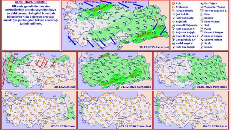 Elazığ Valisi Numan Hatipoğlu, etkili olan kar yağışı ve olumsuz hava koşulları nedeniyle kent genelinde bugün eğitime ara verildiğini duyurdu. Hatipoğlu, ABD merkezli X şirketinin sosyal medya platformundaki hesabından yaptığı paylaşımda, şunları kaydetti: "Değerli öğrenciler olumsuz hava şartları nedeniyle il merkezimizde eğitime 29 Aralık itibarıyla bir gün ara verilmiştir. Hamile ve engelli personelimiz de idari izinli sayılacaktır. İlçelerimiz için kaymakamlıklar duyuru yapacaklar. Gününüzü iyi bir şekilde değerlendirmenizi dilerim." Hatipoğlu, daha sonra yaptığı paylaşımda ise kaymakamlıklarla yapılan görüşmeler neticesinde kent merkezi için alınan kararın ilçelerde de uygulanacağını bildirdi. Aksaray’da etkili olan kar yağışı ve buzlanma nedeniyle 29 Aralık 2025 Pazartesi günü il genelinde eğitime Aksaray Valiliği tarafından bir gün süreyle ara verildi. Valilikten yapılan açıklamada "Meteorolojik verilere göre ilimizde yağan kar yağışı ile birlikte oluşması muhtemel tipi ve buzlanma tehlikesi nedeniyle İl Hıfzıssıhha Kurulu kararı ile 29/12/2025 Pazartesi günü ilimiz genelindeki tüm örgün ve yaygın eğitim kurumlarında eğitim öğretime 1 gün ara verilmiştir. Kamu kurumlarımızda görevli hamile ve engelli personellerimiz ise bir gün idari izinli sayılacaktır" denildi. Tokat'ın Başçiftlik ilçesinde kar yağışı ve olumsuz hava koşulları nedeniyle eğitime bugün ara verildi. İl Milli Eğitim Müdürlüğünden alınan bilgiye göre, ilçede yoğun kar yağışı ve soğuk hava etkili oldu. Buzlanma riski ve ulaşımda yaşanabilecek olumsuzluklara karşı ilçede bugün eğitime ara verildi. Sulusaray ilçesinde ise taşımalı eğitime bugün ara verildi. Bilecik'in Pazaryeri ilçesinde kar yağışı ve olumsuz hava koşulları nedeniyle taşımalı eğitime 1 gün ara verildiği duyuruldu. Pazaryeri Kaymakamlığından yapılan açıklamada, ilçe merkezi hariç taşımalı eğitim kapsamında öğrenim gören öğrenciler için okulların 1 gün süreyle tatil edildiği belirtildi. Ulaşımda yaşanabilecek riskler ve öğrencilerin güvenliği gerekçeleriyle kararın alındığı kaydedilen açıklamada, ilçe merkezindeki okullarda eğitim öğretimin normal seyrinde devam edeceği bildirildi. İlçe merkezinde kar kalınlığı 10 santimetre, yüksek rakımlı köylerde ise yer yer 30 santimetreye ulaştı. Şanlıurfa Valiliği, beklenen kar yağışı ve olumsuz hava koşulları nedeniyle pazartesi günü Halfeti ve Birecik ilçeleri hariç kent genelinde eğitime ara verildiğini duyurdu. Valilikten yapılan açıklamada, meteorolojik değerlendirmelere göre il genelinde pazartesi günü sabah saatlerinden itibaren kar yağışı ve soğuk hava beklendiği belirtildi. Alınan tedbirler kapsamında eğitime bir gün ara verildiği belirtilen açıklamada, şunlar kaydedildi: "Birecik ve Halfeti dışında bütün ilçelerimizdeki tüm eğitim kurumlarında eğitim ve öğretime 29 Aralık Pazartesi günü 1 gün süreyle ara verilmiştir. Ayrıca kamu kuruluşlarında görev yapan engelli ve kronik rahatsızlığı bulunan personel ile hamileler de aynı gün için idari izinli sayılacaktır." Kırşehir Valiliği, olumsuz hava koşulları nedeniyle pazartesi günü il genelinde eğitime ara verildiğini duyurdu. Valilikten yapılan yazılı açıklamada, olumsuz hava şartları ve buzlanma nedeniyle yarın il genelinde ilk ve orta dereceli okullarda eğitim ve öğretime bir günlük ara verildiği belirtildi. Açıklamada, kamu kurum ve kuruluşlarında çalışan engelli ve hamile personelin de bir gün idari izinli sayılacağı kaydedildi. Samsun'un Alaçam ilçesinde etkili olan kar yağışı ve olumsuz hava koşulları nedeniyle 2 taşımalı okulda eğitime 1 gün ara verildi. İlçe Milli Eğitim Müdürlüğünden yapılan açıklamada, Kızlan Ortaokulu ile Şehit Uzman Onbaşı Şükrü Elibol İlkokulu'nda 29 Aralık 2025 Pazartesi günü, 1 gün süreyle eğitime ara verildiği bildirildi. Öğrencilerin ve öğretmenlerin güvenliği göz önünde bulundurularak karar alındığı belirtilen açıklamada, hava şartlarının seyrine göre sürecin yeniden değerlendirileceği kaydedildi. Ayrıca, veliler ve öğrencilerin resmi duyuruları takip etmeleri de istendi. Çankırı'da olumsuz hava koşulları nedeniyle 5 ilçede eğitime bir gün ara verildi. Valilikten yapılan açıklamada, meteorolojik veriler doğrultusunda bölgede etkisini sürdürmesi beklenen yoğun kar yağışı nedeniyle kar ve buzlanmadan kaynaklanabilecek olumsuzluklara karşı önleyici tedbir alındığı belirtildi. Bu nedenle Atkaracalar, Bayramören, Çerkeş, Orta ve Yapraklı ilçelerindeki tüm kademe ve türdeki okullarda yarın eğitim ve öğretime bir gün ara verildiği vurgulanan açıklamada, kamu kurumlarında görevli hamile, engelli, çocuğu ana sınıfına devam eden ebeveynlerin de bir gün süreyle idari izinli sayılacağı ifade edildi. Açıklamada ayrıca, Eldivan, Kurşunlu, Korgun ve Ilgaz ilçelerinde de taşımalı eğitime bir gün ara verildiği bildirildi. Valilikten yapılan açıklamada, il genelinde yoğun kar yağışının etkili olduğu belirtildi. Açıklamada, il genelindeki köy okullarında ve taşımalı eğitim kapsamında eğitim gören öğrenciler ile köy okullarında görevli öğretmenler için eğitim ve öğretime pazartesi günü ara verildiği kaydedildi. Valilikten yapılan açıklamada, meteorolojik değerlendirmeler sonucu kar yağışı ve soğuk hava koşullarının pazartesi günü il genelinde etkili olmasının beklendiği bildirildi. Kent genelinde beklenen kar yağışı ve ardından oluşabilecek buzlanma riskinden dolayı vatandaşların olumsuzluk yaşamaması için gerekli tüm tedbirlerin alındığı belirtilen açıklamada, bu kapsamda Mardin genelindeki tüm eğitim kurumlarında eğitim öğre