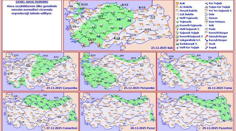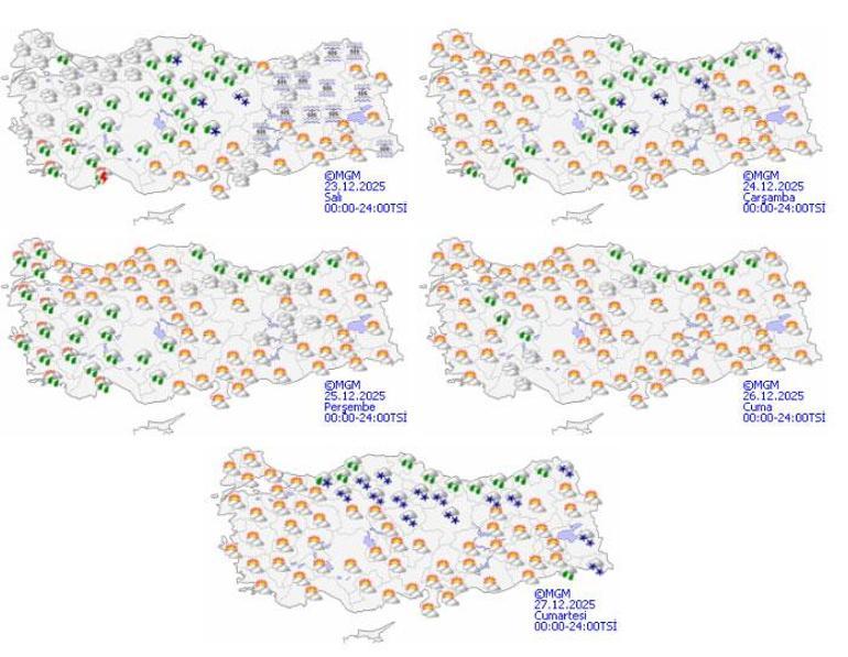 Meteoroloji Genel Müdürlüğünden alınan tahminlere göre, ülkemiz genelinin parçalı ve çok bulutlu, Batı Akdeniz, İç Anadolu'nun kuzey ve batısı, Batı Karadeniz'in iç kesimleri, Orta Karadeniz ile İstanbul, Kocaeli, Sakarya, Yalova, Muğla, Denizli ve Afyonkarahisar çevrelerinin aralıklı yağışlı geçeceği tahmin ediliyor. Yağışların, genellikle yağmur ve sağanak, Batı Akdeniz kıyılarında gök gürültülü sağanak, Batı Karadeniz’in iç kesimleri ile İç Anadolu'nun kuzeydoğusunun yükseklerinde karla karışık yağmur ve yer yer kar şeklinde olması bekleniyor. Sabah ve gece saatlerinde Marmara ile iç ve doğu bölgelerde pus ve yer yer sis bekleniyor.