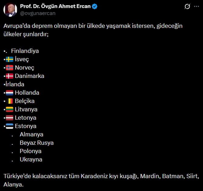 Prof. Dr. Övgün Ahmet Ercan, Avrupa’da deprem riski bulunmayan ülkeler arasında Finlandiya, İsveç, Norveç, Danimarka, İrlanda, Hollanda, Belçika, Litvanya, Letonya, Estonya, Almanya, Beyaz Rusya, Polonya ve Ukrayna’nın yer aldığını belirtti.