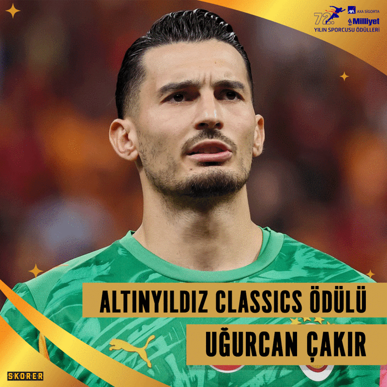 Uğurcan Çakır: Öncelikle herkese merhaba. Beni bu ödüle layık gören herkese teşekkürler. Her ödül aldığımda çocuklarıma anı olması için alıyorum. Bugün de çok güzel bir ödül aldık. 24 yıl sonra Dünya Kupası'na gidiyoruz, umarım orada da ülkemizi gururlandırmaya devam ederiz. Her yerde ülkemizi en iyi yerlerde temsil etmek istiyoruz. Takım arkadaşlarım, hocalarım, başkanım burada. İnşallah ülkemizi yine en iyi şekilde temsil ederiz.