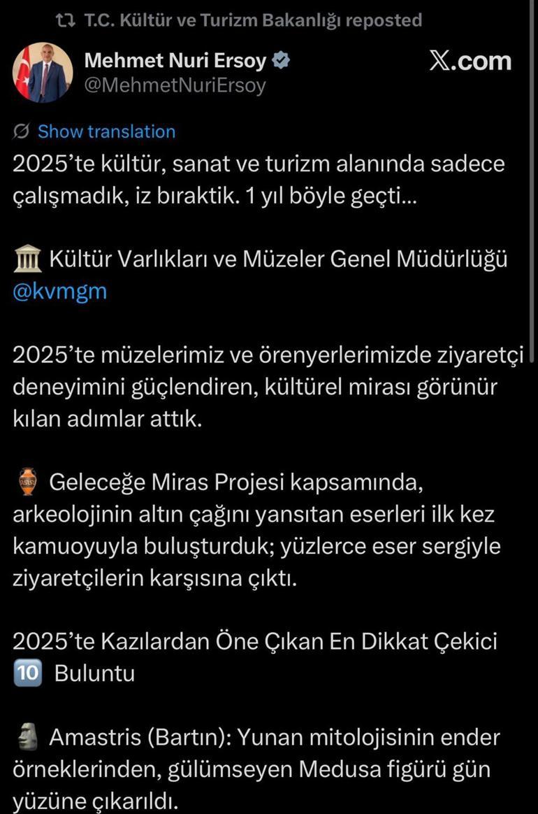 Kültür ve Turizm Bakanı Mehmet Nuri Ersoy, 'Geleceğe Miras' projesi kapsamında 2025 yılının en dikkat çekici arkeolojik buluntularını sosyal medya hesabından paylaştı.