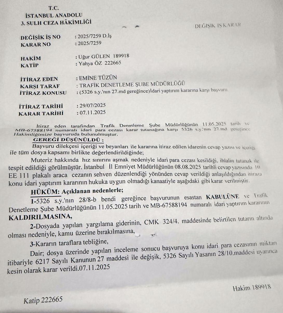 Bu cezaların tebligatı 2022 yılında yapılan Emine Tüzün, itirazları sonrası haklı bulundu ve cezalar iptal edildi. 2024 yılı Mayıs ayında İstanbul Kuzey Çevre Yolu'nda hız sınırını aştığı gerekçesiyle 690 lira ceza yazıldığına dair bir tebligat alan Emine Tüzün, buna da itiraz etti.