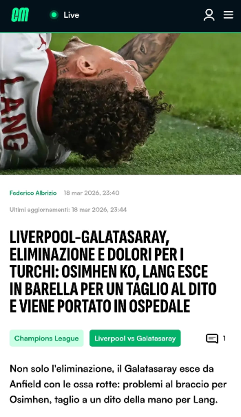 CALCIOMERCATO (İTALYA): Galatasaray sadece elenmekle kalmadı, Anfield'dan kırık kemiklerle ayrıldı: Osimhen kolundan sakatlandı, Lang'ın parmağı kesildi. Nijeryalı forvet dişini sıkarak ilk yarının geri kalanını bandajla oynamaya çalıştı ancak ikinci yarıda sahaya çıkmadı. Reklam panolarıyla çarpışan Lang ise sahadan sedyeyle taşındı, hastaneye kaldırıldı.