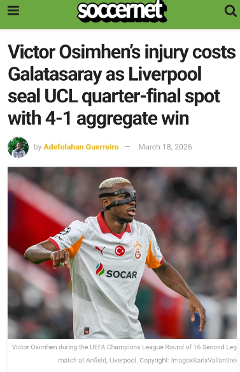SOCCERNET (NİJERYA): Victor Osimhen'in sakatlığı Galatasaray'a pahalıya mal oldu, Liverpool toplamda 4-1'lik skorla Şampiyonlar Ligi çeyrek finaline yükseldi. 27 yaşındaki oyuncunun eli bandajlandı, ancak zar zor ayakta durabiliyordu ve normalde yaptığı gibi oyuna dahil olup baskı yapamıyordu. Osimhen sahada kalmak için canla başla mücadele etti, devrede oyundan çıktı. Nijeryalı oyuncunun yokluğu Galatasaray'ın performansının daha da kötüye gitmesiyle hissedildi.