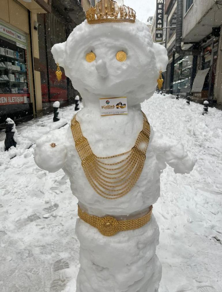 Nizip ilçesinde ise bir kuyumcu, kar yağışı nedeniyle müşteri gelmeyince iş yerinin önüne yaptığı kardan gelini altınlarla süsledi. Boynuna bilezikler ve kolyeler takılan kardan gelin vatandaşların ilgisini çekerken ortaya renkli görüntüler çıktı.