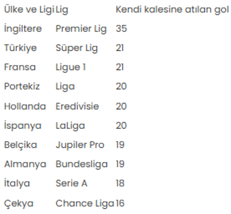 Avrupa'nın en büyük 10 ligi içinde kıtanın 5 büyük futbol organizasyonuna sahip İngiltere (Premier Lig), İspanya (LaLiga), İtalya (Serie A), Almanya (Bundesliga) ve Fransa'nın (Ligue 1) yanı sıra Portekiz, Hollanda, Belçika, Türkiye ve Çekya liglerinde bu sezon şimdiye kadar kendi kalesine atılan gol sayıları dikkati çekiyor.