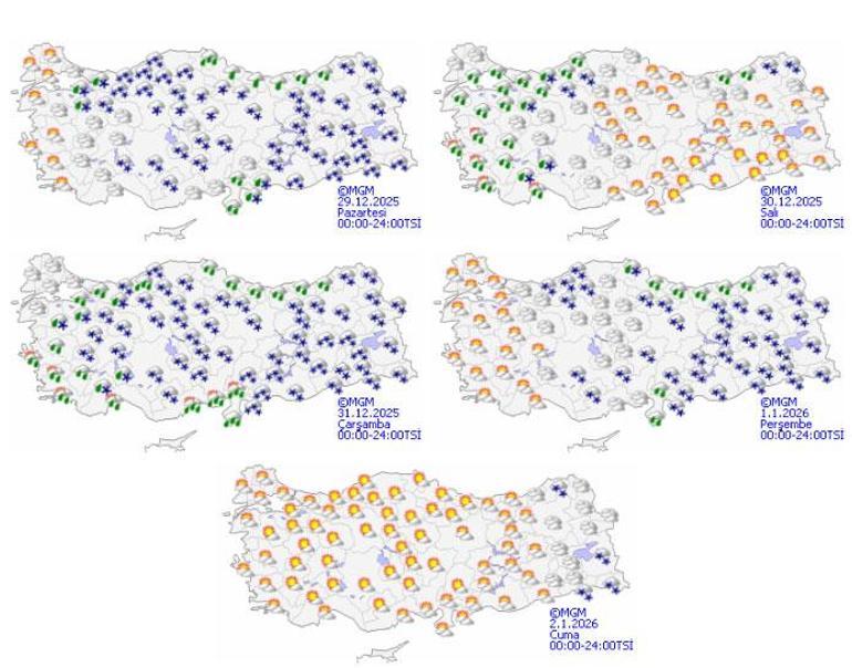 Diyarbakır’da etkili olan kar yağışı nedeni ile bugün öğleden sonra tüm okullar tatil edildi. Diyarbakır’da sabah saatlerinde aniden bastıran kar yağışı hayatın olumsuz etkiledi. Kentte buzlanma nedeni ile birçok kaza meydana gelirken, sürücüler araçlarını bırakıp toplu taşımaya yöneldi. Kar nedeni kent genelinde eğitime öğleden sonra ara verildi. Bolu'da etkili olan yoğun kar yağışı ve buzlanma nedeniyle yarın il genelinde eğitim öğretime 1 gün ara verildi. Bolu Valiliğinden yapılan açıklamada, kent genelinde olumsuz hava şartlarının etkisini sürdürdüğü belirtildi. Açıklamada, yoğun kar yağışı ve buzlanma sebebiyle 30 Aralık Salı günü, resmi ve özel tüm eğitim kurumlarında, rehabilitasyon merkezleri, motorlu taşıt sürücü kursları ve Kur'an kursları dahil olmak üzere eğitime bir gün ara verildiği ifade edildi. Öte yandan, kamu kurumlarında görevli hamile ve engelli personelin yarın idari izinli sayılacağı bildirildi. Ayrıca, bugün de okullar tatil edilmişti. Şırnak merkez ve 4 ilçede kar yağışı nedeniyle bugün öğleden sonra ve yarın eğitime ara verildiği bildirildi. Valilikten yapılan açıklamada, kent merkezi, Güçlükonak, Uludere ve Beytüşşebap ilçelerinde yoğun kar yağışı ve buzlanma nedeniyle resmi ve özel kreşler, anaokulları, ortaokul ve liseler, mesleki eğitim merkezleri, yaygın eğitim kurumları, özel öğretim kursları ile özel eğitim ve rehabilitasyon merkezlerinde bugün öğleden sonra ve yarın eğitime ara verildiği belirtildi. Açıklamada, İdil ilçesinde de köy okulları ve taşımalı eğitimin bu kapsamda olduğu ifade edildi. Ayrıca, bu süre zarfında merkez ve belirtilen ilçelerde malul, engelli, ağır kronik rahatsızlığı olan ve hamile kamu çalışanlarının da idari izinli sayılacağı kaydedildi. Bingöl'de etkisini sürdüren yoğun kar yağışı ve olumsuz hava şartları nedeniyle eğitime 1 gün ara verildi. Bingöl Valiliği'nden yapılan açıklamada, "İlimiz genelinde bu sabah başlayan ve devam eden yoğun kar yağışı ve olumsuz hava şartlarına bağlı olarak buzlanma ve ulaşımda oluşabilecek risk ve tehlikelere karşı tedbir amacıyla; il merkezi genelindeki tüm resmi ve özel okullar ile özel öğretim kurumlarında 29.12.2025 Pazartesi günü (Bugün) öğleden sonra eğitim öğretime ara verilmiştir. Kamuda çalışan engelli ve hamile personelimiz de aynı sürede idari izinli sayılacaklardır" denildi. Meteoroloji Genel Müdürlüğü tarafından yapılan tahminlere göre: Ülkemiz genelinin parçalı ve çok bulutlu, Marmara ve Doğu Akdeniz'in doğusu, İç Anadolu'nun kuzey ve doğusu ile Karadeniz, Doğu ve Güneydoğu Anadolu Bölgelerinin yağışlı geçeceği tahmin ediliyor. Orta Karadeniz kıyıları ile İskenderun Körfezi çevrelerinde yağmur, diğer yerlerde karla karışık yağmur ve kar şeklinde görülecek yağışların, Batı Karadeniz, Güneydoğu Anadolu'nun doğu, Doğu Anadolu'nun güneydoğu kesimleri ile Sakarya çevrelerinde kuvvetli olması bekleniyor. Kuzey, iç ve doğu kesimlerde buzlanma ve don ile birlikte pus, yer yer sis görüleceği tahmin ediliyor. HAVA SICAKLIĞI: Hava sıcaklığının, hissedilir derecede azalarak ülke genelinde mevsim normallerinin altında seyretmesi bekleniyor. RÜZGAR: Rüzgarın genellikle kuzeyli yönlerden, yurdun kuzey ve batı kesimlerinde akşam saatlerinden sonra zamanla güney ve batılı yönlerden hafif, arasıra orta kuvvette; Marmara, Güney Ege, Akdeniz, İç Anadolu'nun güneyi, Karadeniz kıyıları, Doğu Anadolu'nun güneydoğusu ve Güneydoğu Anadolu'nun doğusunda kuvvetli (40-70 km/saat) esmesi bekleniyor. KUVVETLİ YAĞIŞ UYARISI1: Zonguldak, Düzce, Bartın, Bolu, Karabük, Kastamonu çevreleri ile Sinop’un kuzeybatısında kuvvetli ve yer yer yoğun (20 cm üzeri) kar yağışı bekleniyor. Yağışların, kıyı kesimlerde yağmur şeklinde başlayarak zamanla karla karışık yağmur ve kar şeklinde olacağı tahmin ediliyor. Kuvvetli yağışların, 29.12.2025 Pazartesi akşam saatlerine kadar etkili olması beklendiğinden ulaşımda aksamalar, buzlanma ve don ile tipi şeklinde kar yağışı gibi olumsuzluklara karşı dikkatli ve tedbirli olunmalıdır. KUVVETLİ YAĞIŞ UYARISI2: Yapılan son değerlendirmelere göre; yarın (Pazartesi) sabah ilk saatlerden itibaren bölgenin batısından başlayacak olan kar yağışlarının, zamanla etkisini artırarak Şanlıurfa, Diyarbakır'ın güney ve doğusu, Batman, Bitlis, Siirt ve Van çevrelerinde orta kuvvette (5-15 cm), Mardin, Şırnak ve Hakkari illerinde kuvvetli ve yer yer yoğun (15-25 cm) olması beklendiğinden başta buzlanma ve don olayına bağlı ulaşımda aksamalar ile yerde kar örtüsü olan yüksek ve eğimli alanlarda çığ riski gibi olumsuzluklara karşı dikkatli ve tedbirli olunması gerekmektedir. KUVVETLİ RÜZGAR UYARISI: Rüzgarın, Marmara, Güney Ege, Akdeniz, İç Anadolu'nun güneyi, Karadeniz kıyıları, Doğu Anadolu'nun güneydoğusu ve Güneydoğu Anadolu'nun doğusunda kuzeyli yönlerden kuvvetli (40-70 km/saat) esmesi beklendiğinden yaşanabilecek olumsuzluklara karşı dikkatli ve tedbirli olunması gerekmektedir. BUZLANMA VE DON OLAYI UYARISI: Kuzey, iç ve doğu kesimlerde buzlanma ve don olayı beklendiğinden yaşanabilecek olumsuzluklara karşı dikkatli ve tedbirli olunması gerekmektedir. Bazı illerde beklenen hava durumuyla günün en yüksek sıcaklıkları ise şöyle: Ankara: Parçalı ve çok bulutlu, öğle saatlerinde hafif kar yağışlı 1 İstanbul: Parçalı ve çok bulutlu 6 İzmir: Parçalı ve az bulutlu 9 Bursa: Parçalı ve çok bulutlu, aralıklı yağmur ve karla karışık yağmurlu, yüksekleri kar yağışlı 5 Adana: Parçalı ve çok bulutlu 13 Antalya: Parçalı ve az bulutlu 14 Samsun: Parçalı ve çok bulutlu, öğle saatlerinde hafif yağmurlu 9 Trabzon: Parçalı ve çok 